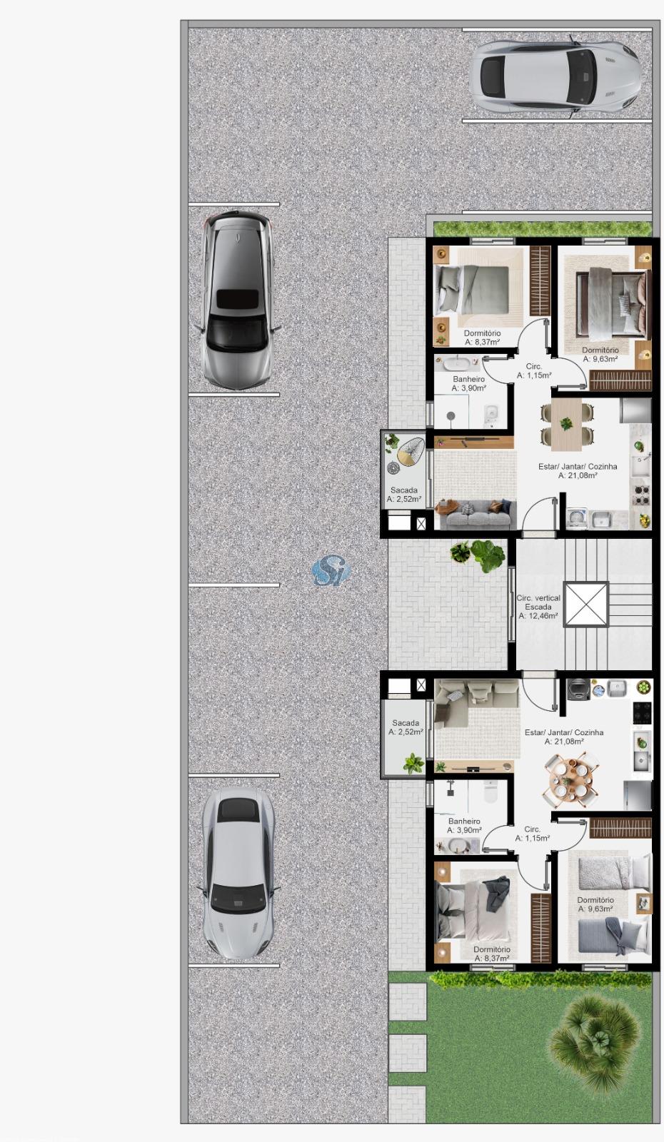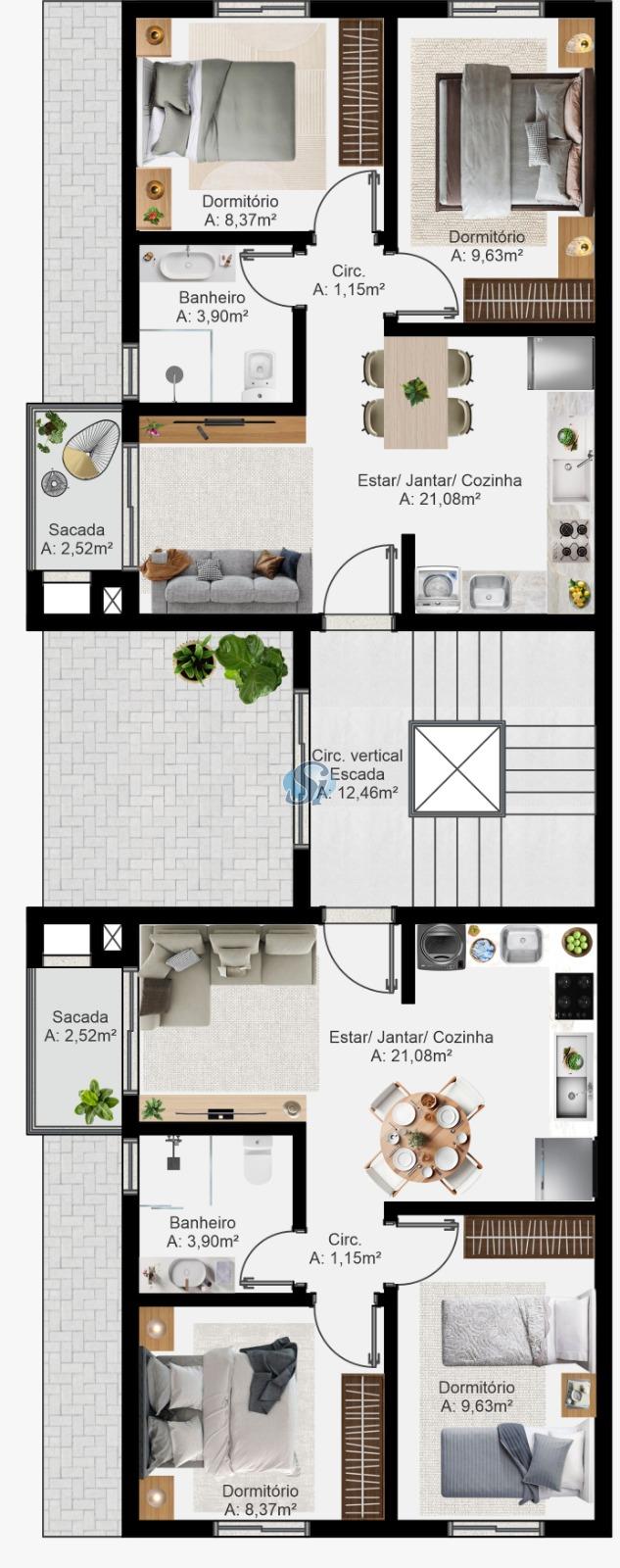 Apartamentos com 2 dormitórios, sala e cozinha integrados, banheiro, 1 vaga de garagem