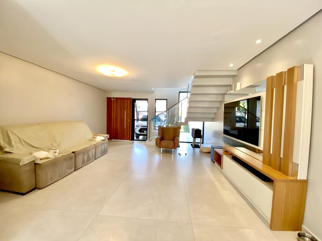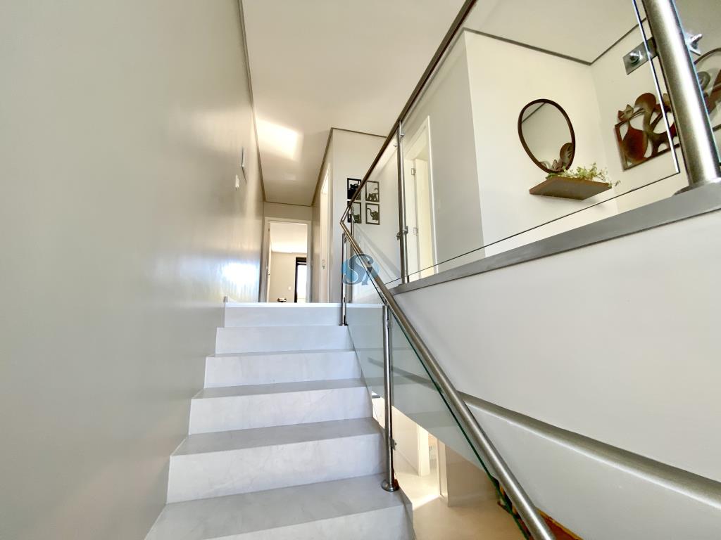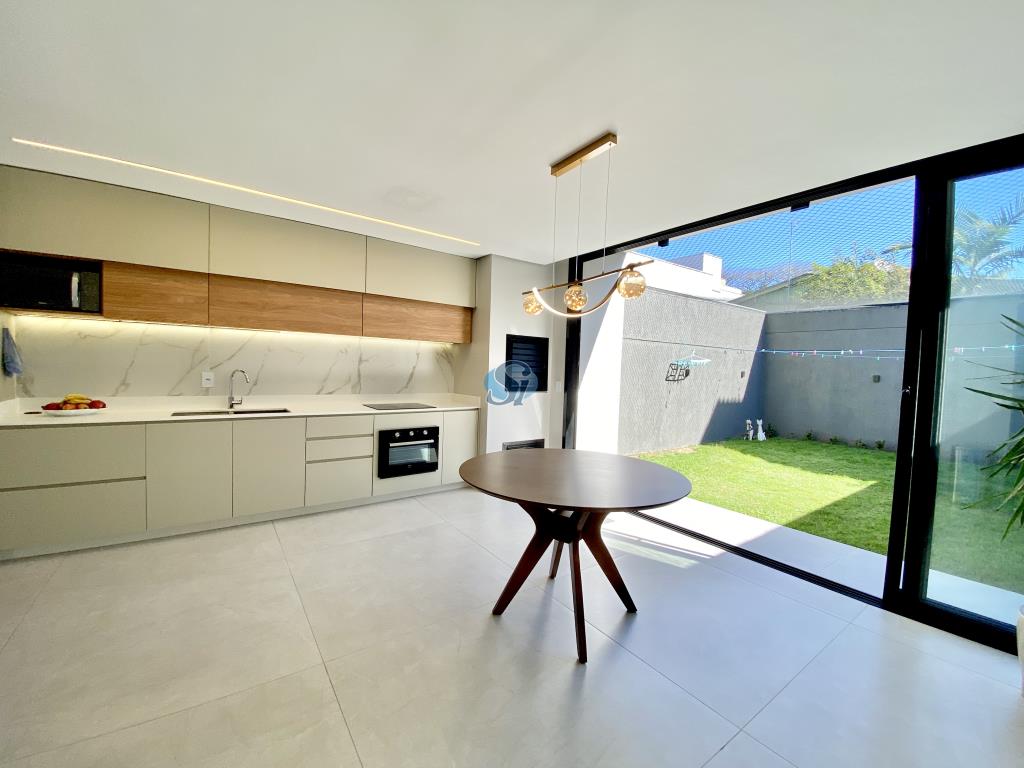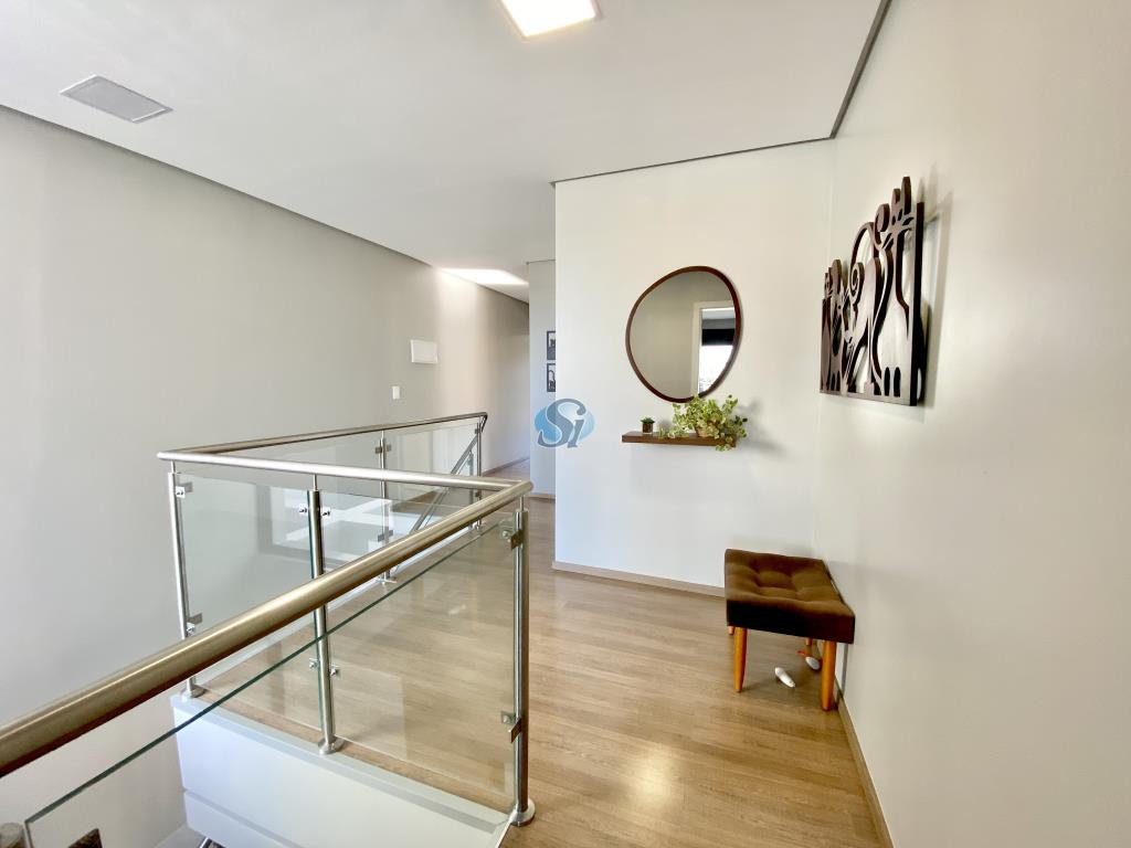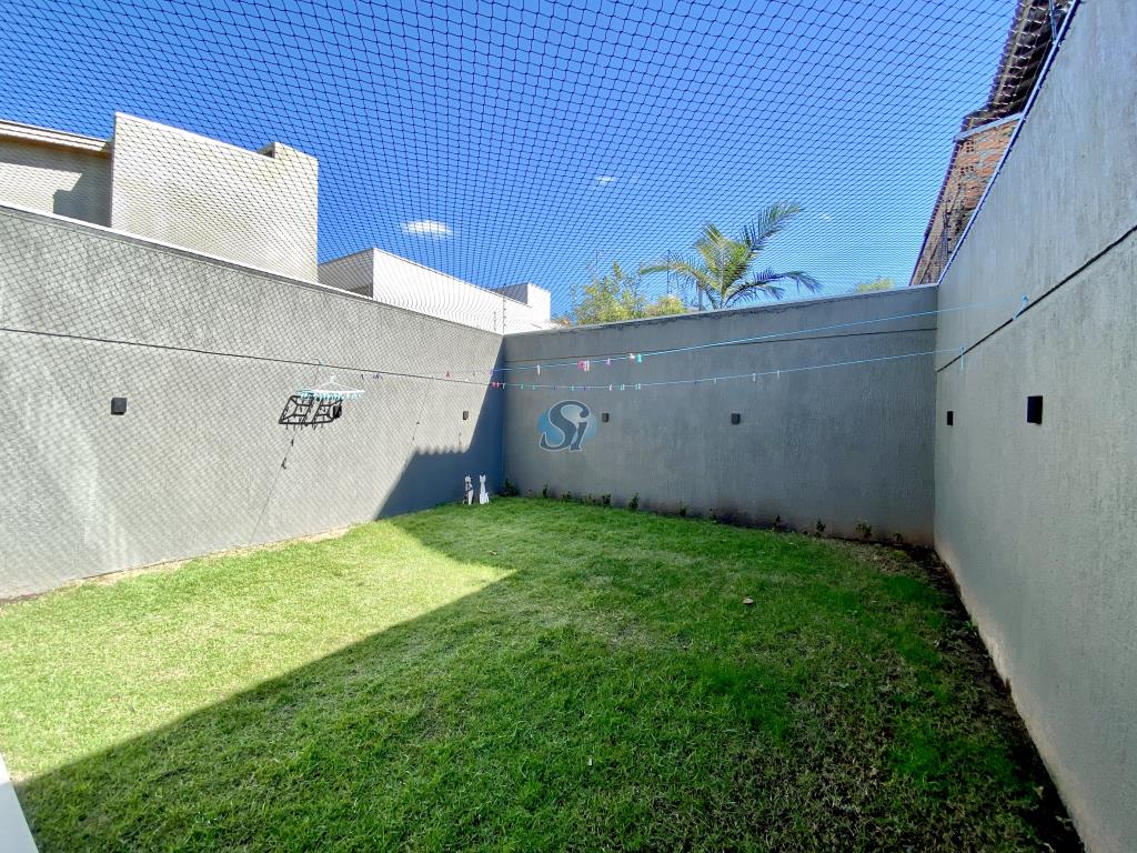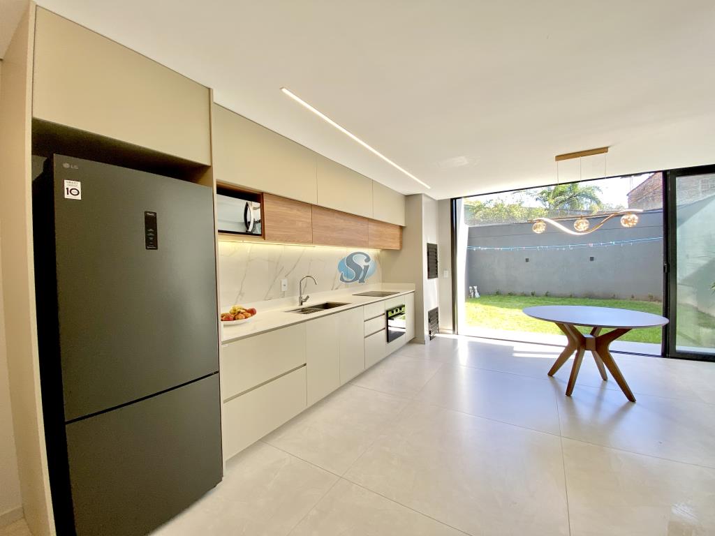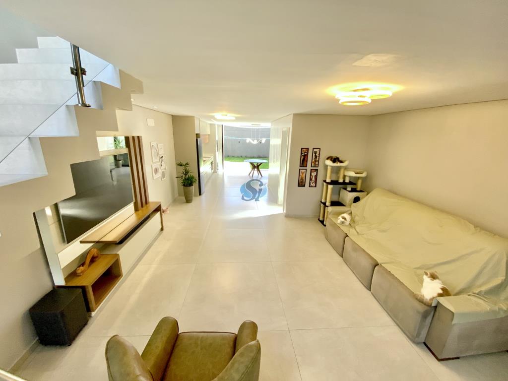 Este imóvel conta com três dormitórios, sendo uma suíte com closet, além de banheiro social e lavabo. A área social é integrada, unindo sala de estar, cozinha e sala de jantar, conta com sacada tanto na frente quanto nos fundos, atendendo à suíte e ao quarto dos fundos. Os três quartos possuem persianas automatizadas. O piso é em porcelanato no térreo e laminado no andar superior, com teto todo em gesso nos dois andares. Os banheiros são equipados com box elegance. Há grades de segurança na janela frontal, no lavabo e na lavanderia, além de churrasqueira. Em termos de segurança, o pátio é cercado e murado, conta com cerca elétrica em todo o terreno e portão automatizado, cozinha planejada ? completa e nova, garagam para dois carros lado a lado