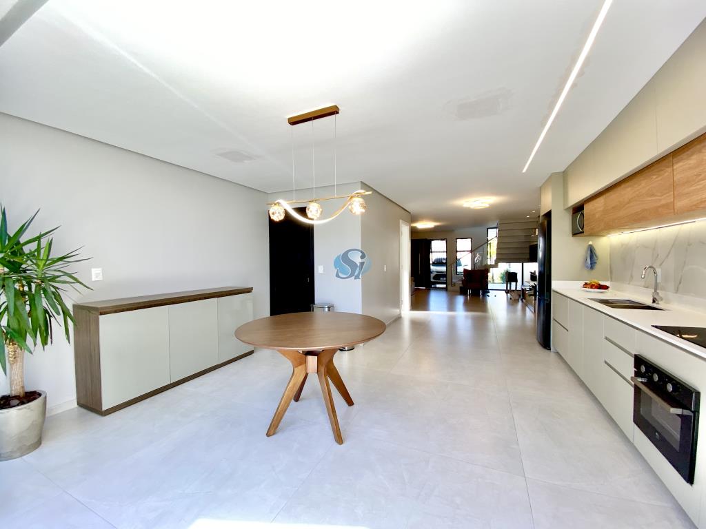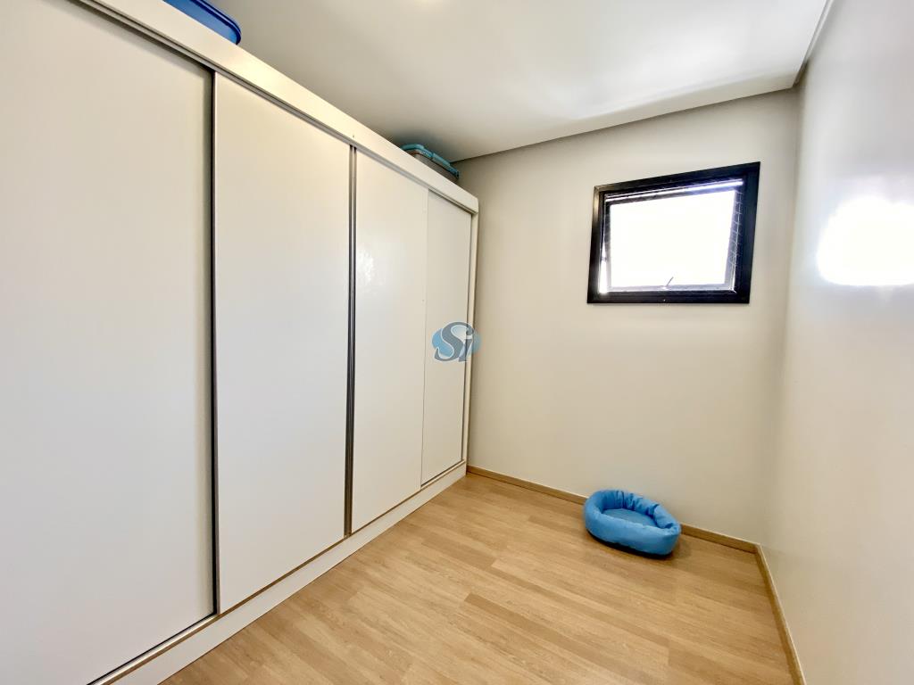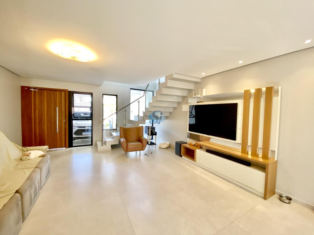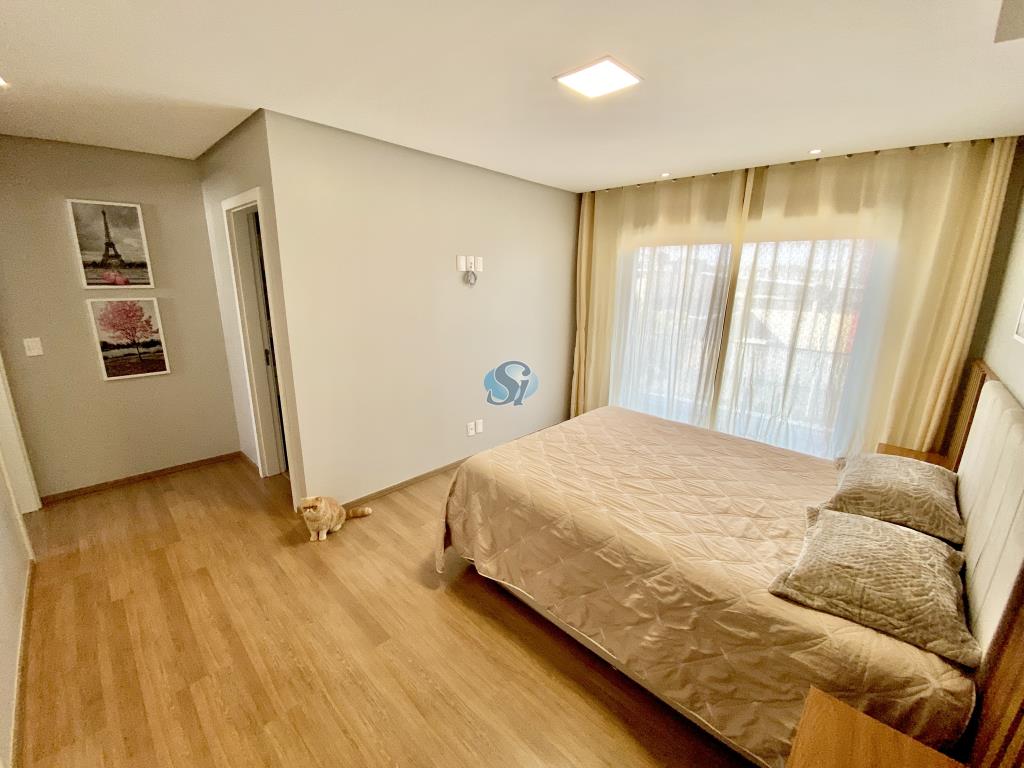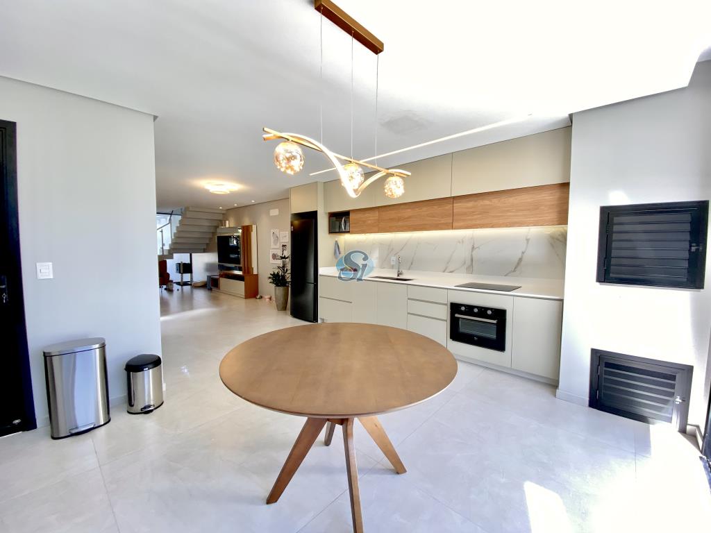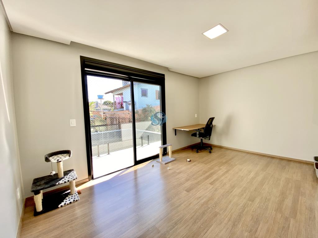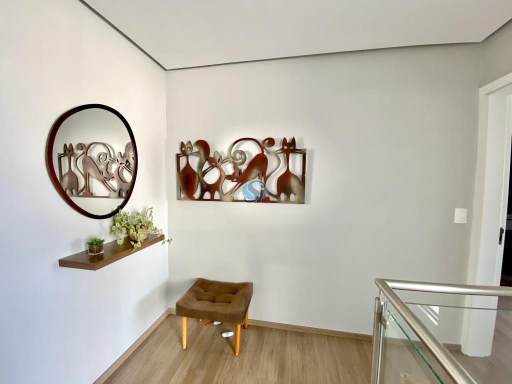 Este imóvel conta com três dormitórios, sendo uma suíte com closet, além de banheiro social e lavabo. A área social é integrada, unindo sala de estar, cozinha e sala de jantar, conta com sacada tanto na frente quanto nos fundos, atendendo à suíte e ao quarto dos fundos. Os três quartos possuem persianas automatizadas. O piso é em porcelanato no térreo e laminado no andar superior, com teto todo em gesso nos dois andares. Os banheiros são equipados com box elegance. Há grades de segurança na janela frontal, no lavabo e na lavanderia, além de churrasqueira. Em termos de segurança, o pátio é cercado e murado, conta com cerca elétrica em todo o terreno e portão automatizado, cozinha planejada ? completa e nova, garagam para dois carros lado a lado