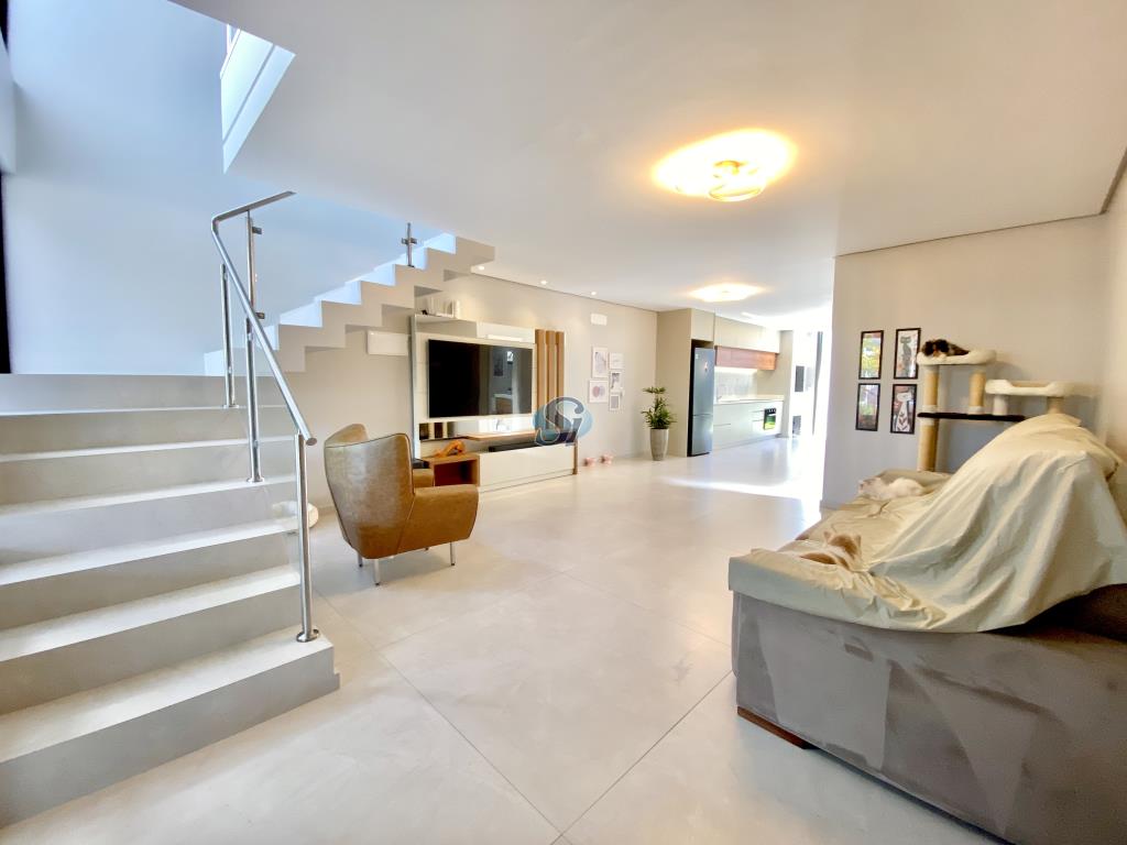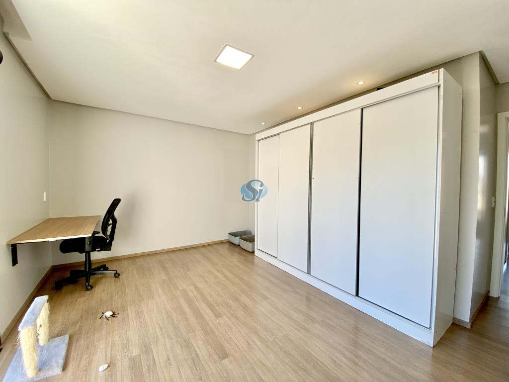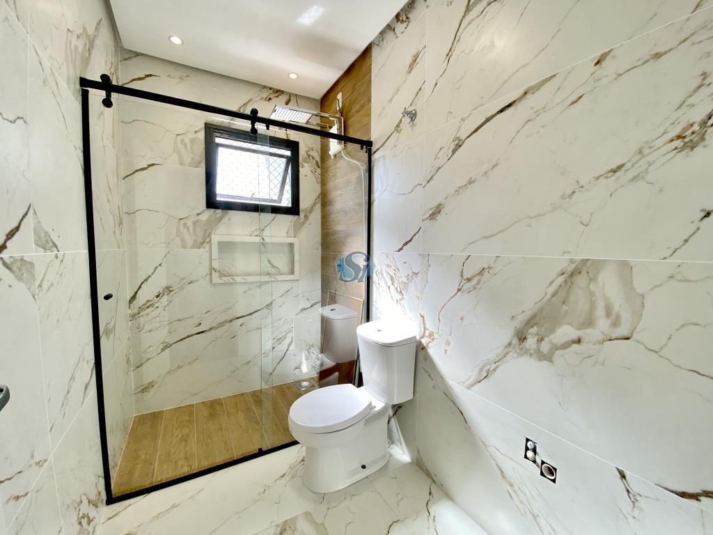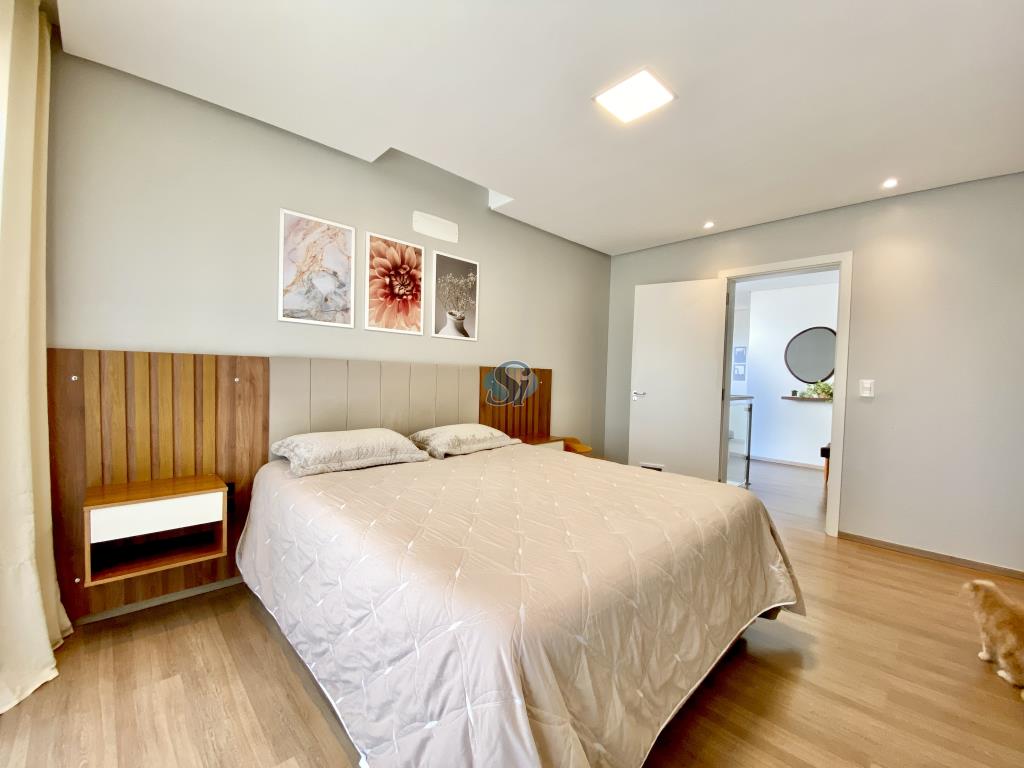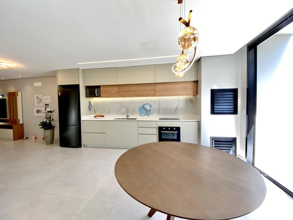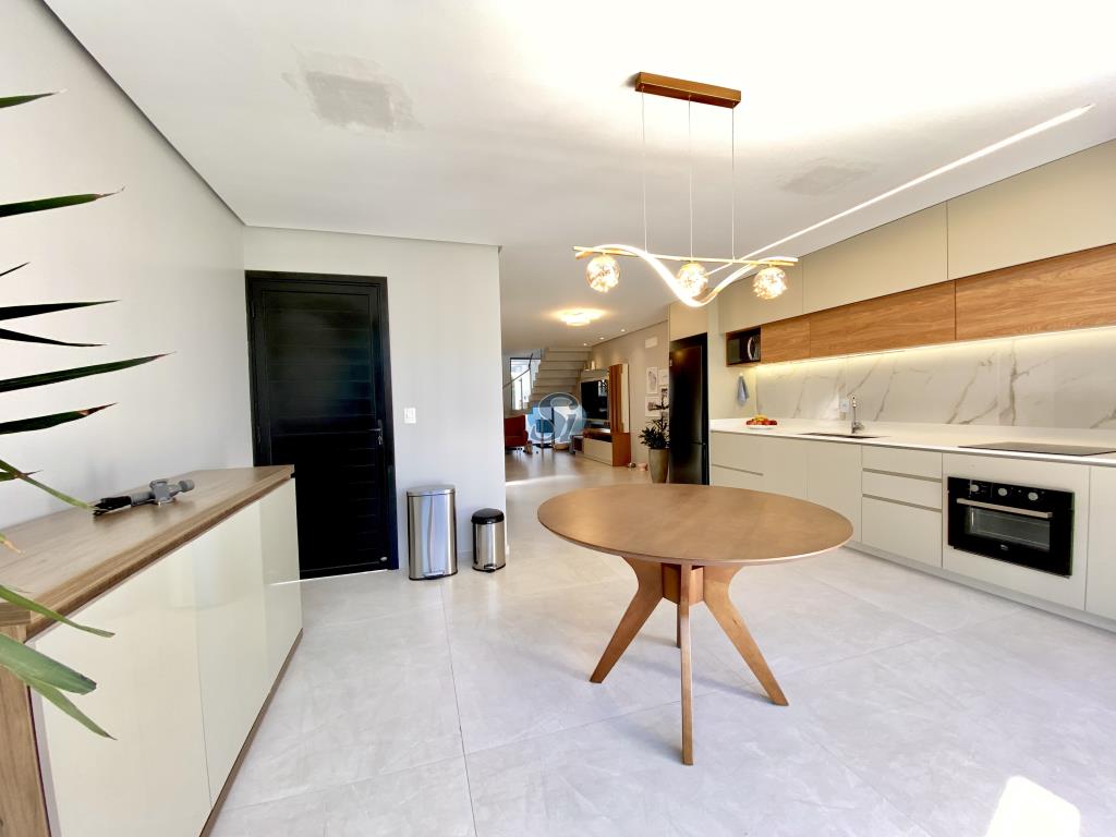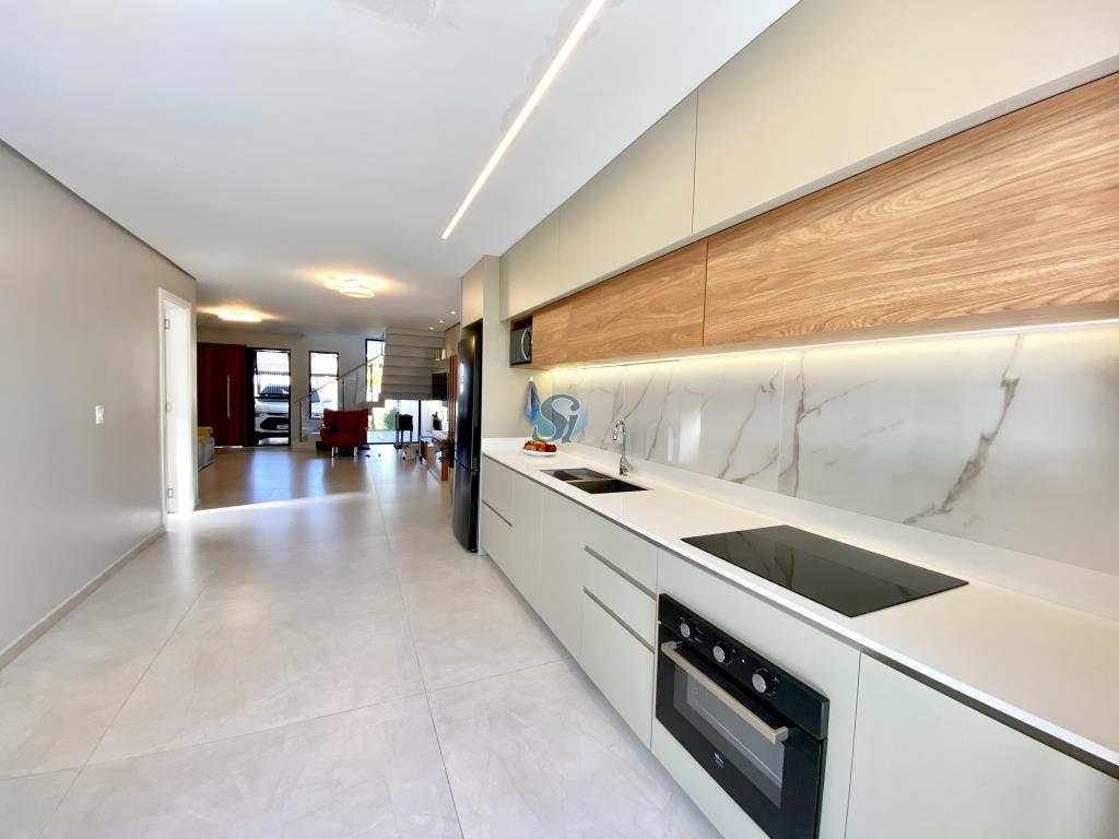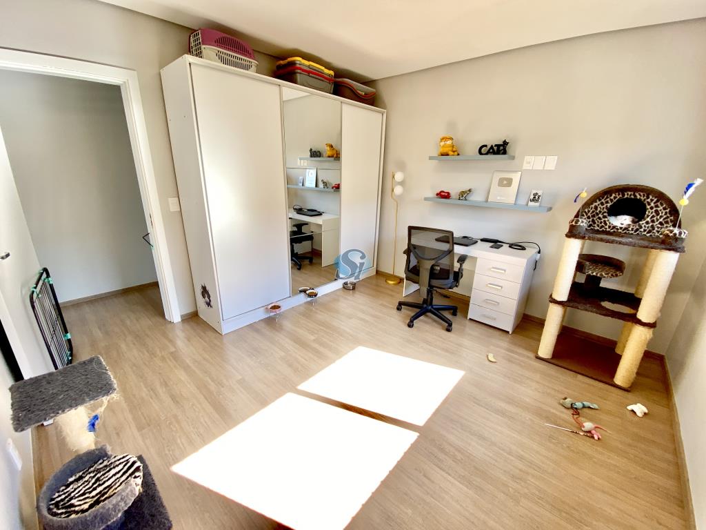 Este imóvel conta com três dormitórios, sendo uma suíte com closet, além de banheiro social e lavabo. A área social é integrada, unindo sala de estar, cozinha e sala de jantar, conta com sacada tanto na frente quanto nos fundos, atendendo à suíte e ao quarto dos fundos. Os três quartos possuem persianas automatizadas. O piso é em porcelanato no térreo e laminado no andar superior, com teto todo em gesso nos dois andares. Os banheiros são equipados com box elegance. Há grades de segurança na janela frontal, no lavabo e na lavanderia, além de churrasqueira. Em termos de segurança, o pátio é cercado e murado, conta com cerca elétrica em todo o terreno e portão automatizado, cozinha planejada ? completa e nova, garagam para dois carros lado a lado