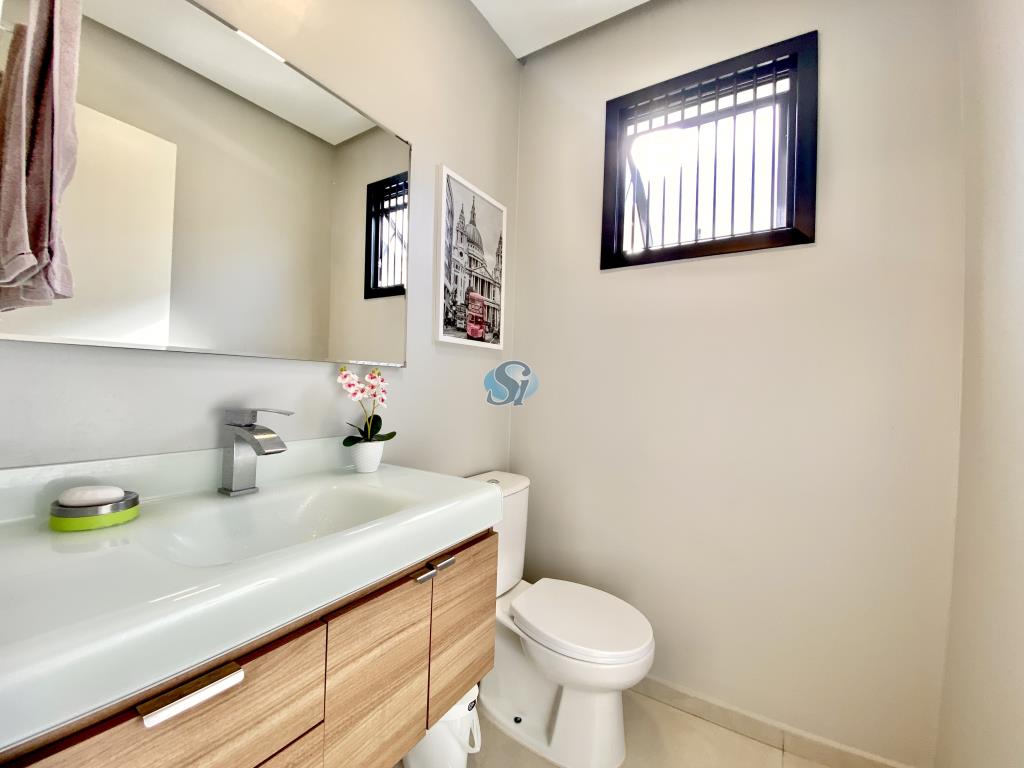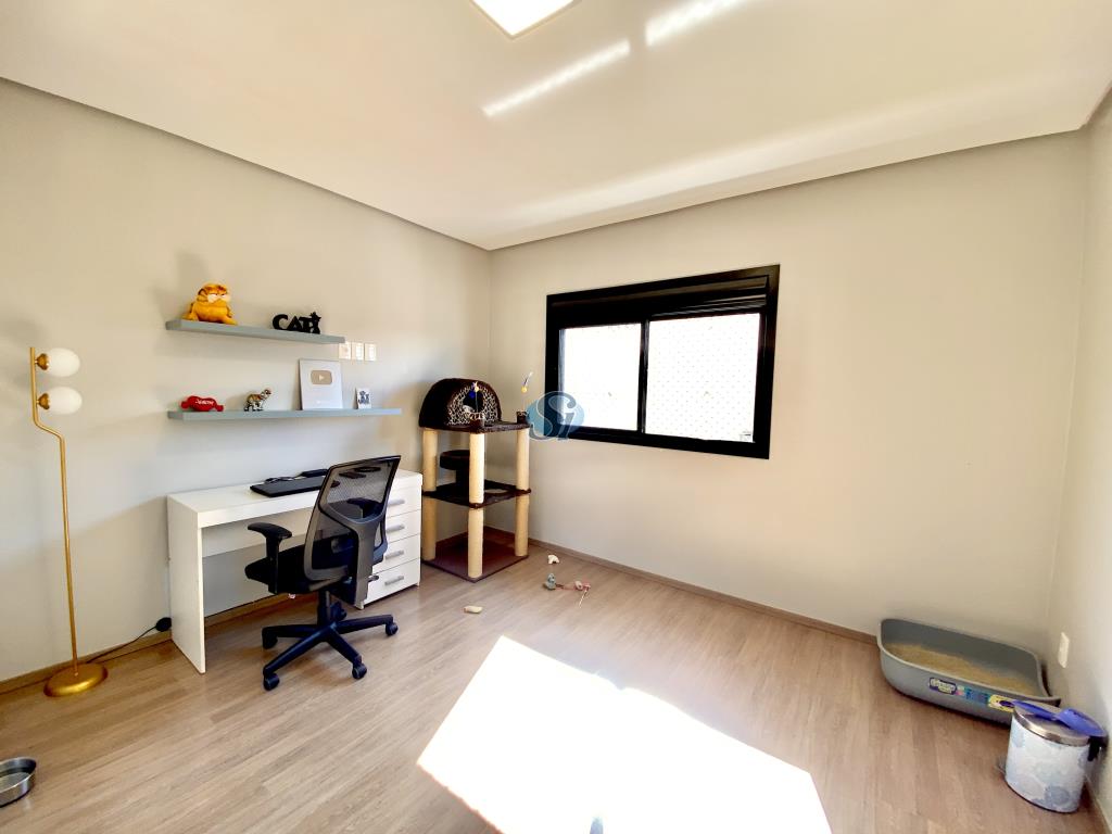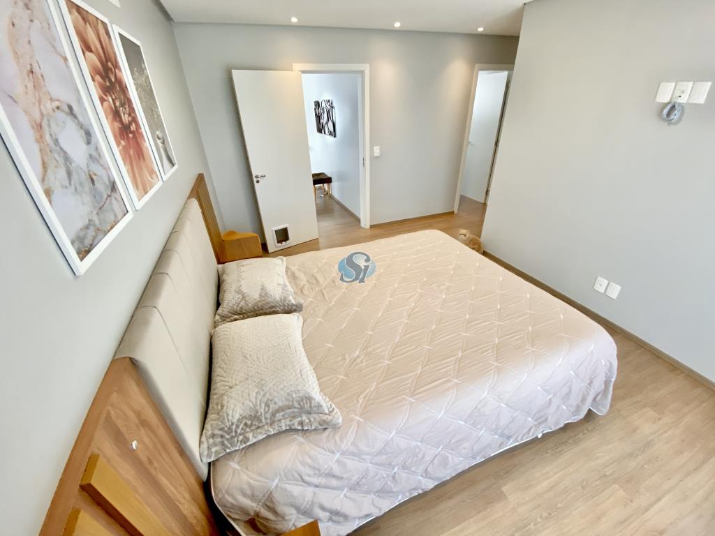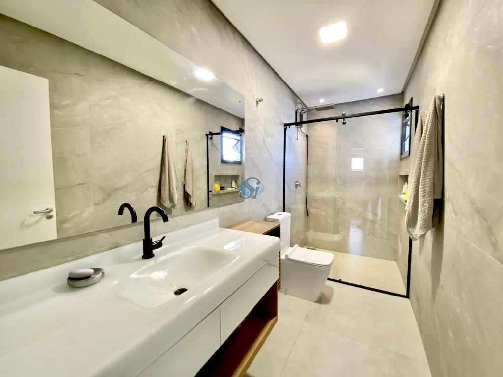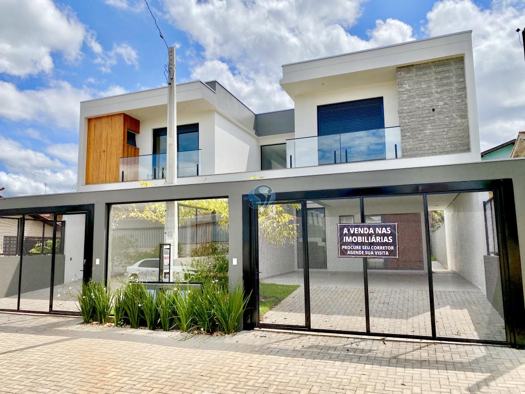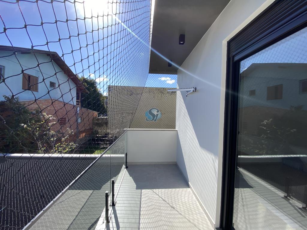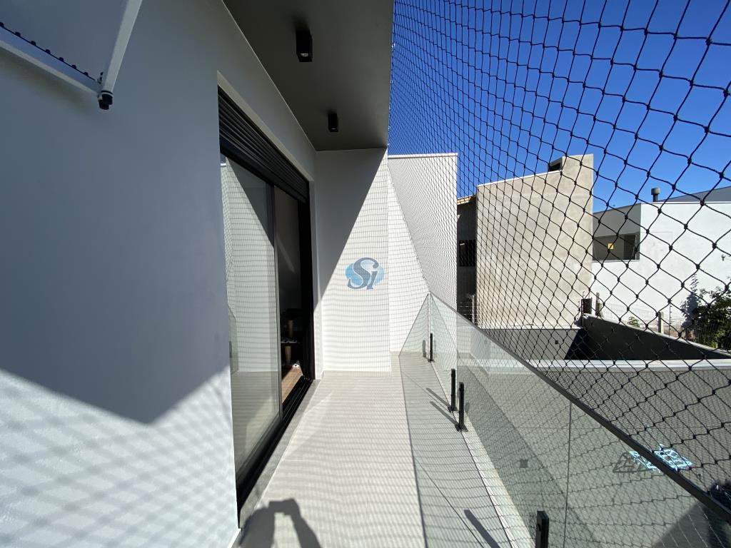 Este imóvel conta com três dormitórios, sendo uma suíte com closet, além de banheiro social e lavabo. A área social é integrada, unindo sala de estar, cozinha e sala de jantar, conta com sacada tanto na frente quanto nos fundos, atendendo à suíte e ao quarto dos fundos. Os três quartos possuem persianas automatizadas. O piso é em porcelanato no térreo e laminado no andar superior, com teto todo em gesso nos dois andares. Os banheiros são equipados com box elegance. Há grades de segurança na janela frontal, no lavabo e na lavanderia, além de churrasqueira. Em termos de segurança, o pátio é cercado e murado, conta com cerca elétrica em todo o terreno e portão automatizado, cozinha planejada ? completa e nova, garagam para dois carros lado a lado