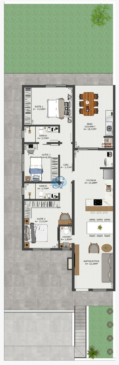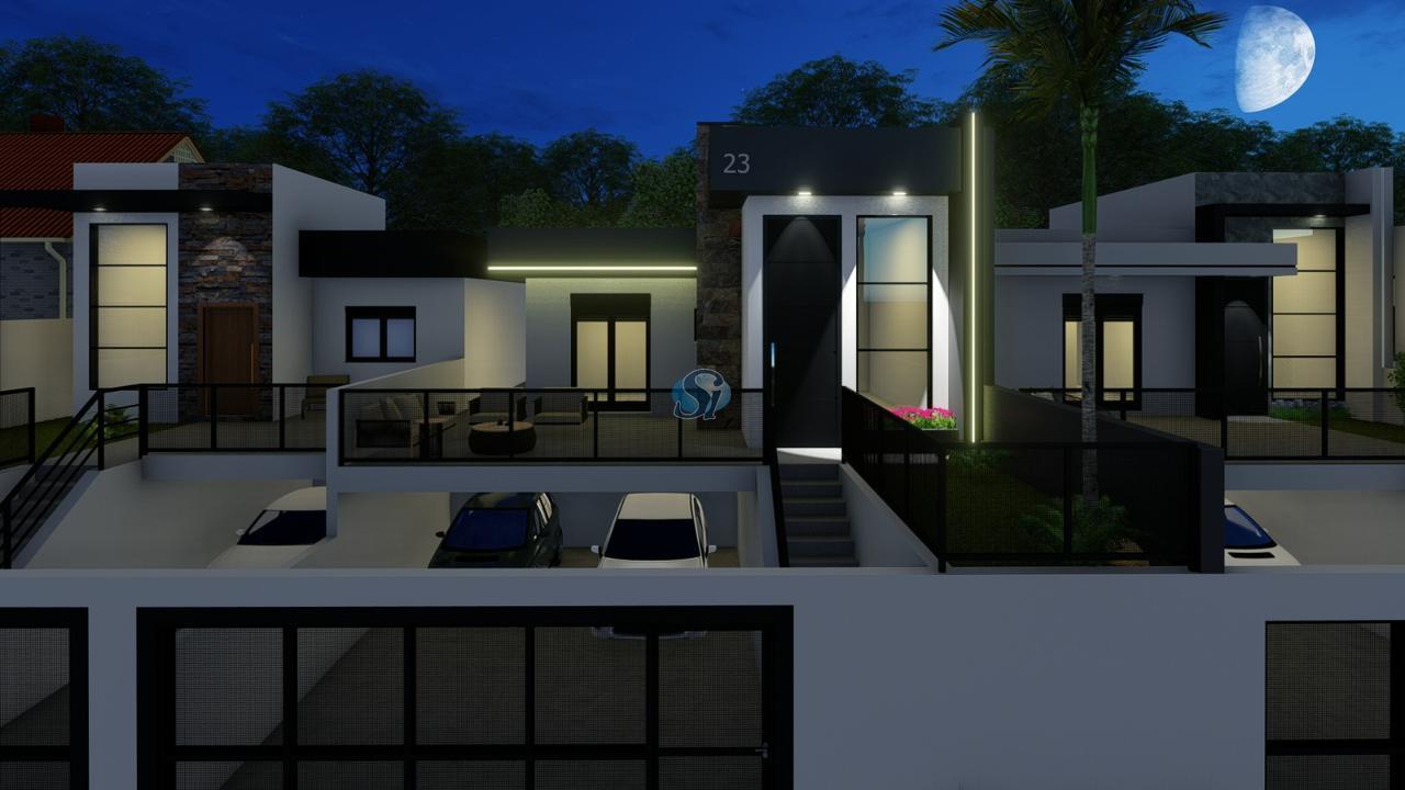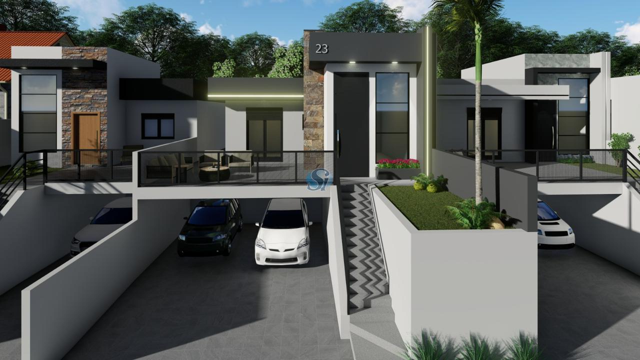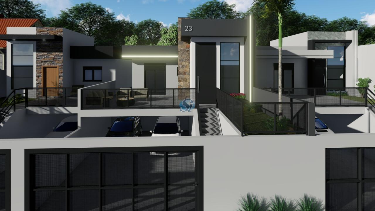 03 dormitórios; 1 quarto com suíte e sacada; 2 quartos, compartilhando uma suíte americana; 1 Lavabo; Área de serviço; Sala de estar/jantar e cozinha integrados; Aberturas em alumínio preto; Piso porcelanato; Rebaixo em gesso na sala de estar/jantar e cozinha; Vagas para 2 carros lado a lado coberta; Lareira; Ampla área Gourmet com churrasqueira; Espera para ar condicionado, água quente/gás, espera para energia solar; Piscina instalada; Toda murada, cercada, com portão de contrapeso, guarda corpo e com grama; Casa localizada em bairro alto da cidade e com uma vista incrível;