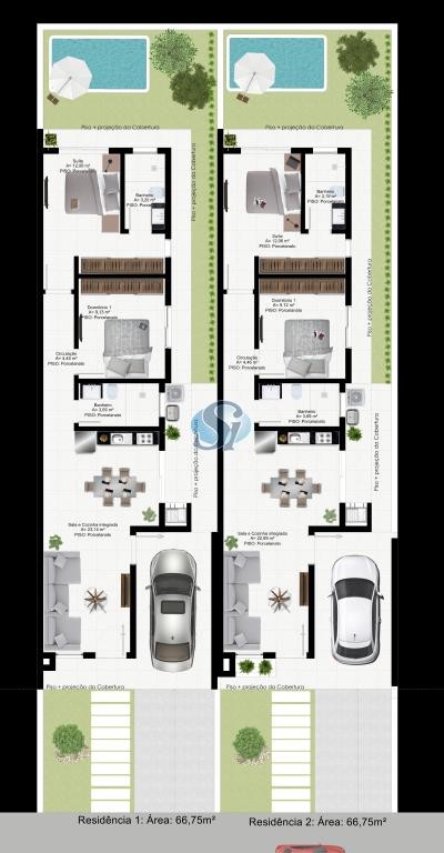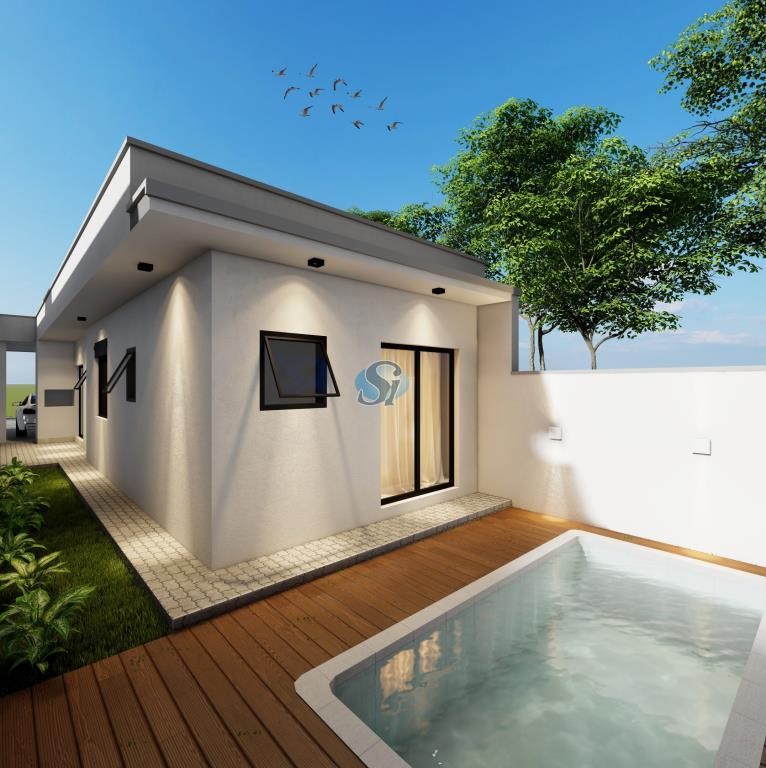 Casa com 2 dormitórios (1 suíte), banheiro social, área gourmet com churrasqueira, espaço para piscina, lavanderia, garagem, esperas para ar condicionado, energia solar .